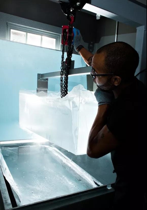 俗話說,冰凍三尺,非一日之寒。手鑿的冰塊取材自巨型冰板(block of ice),而制作它需要使用特殊的冰板制作儀(block ice machine)。冰板的制作通常要三至四天,在緩慢的冰凍過程中儀器需不斷攪拌,使水中的氣泡消失,直至冰塊完全純凈透明。沒有任何氣泡摻雜的冰塊有著更高的密度,稀釋速率也就隨之降低。